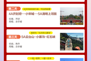早餐后乘坐旅游大巴车赴八朝古都开封,开封是世界上一座城市中轴线从未变动的都城,城摞城遗址在世界考古史和都城史上都极其罕见,北宋时期,开封城是当时世界第一大城市,是清明上河园的创作地。后游览以历史名画《清明上河图》为蓝本创建的大型宋代民俗风情园,国家AAAAA级景区【清明上河园】,园区再现北宋东京开封城的盛世繁荣场景,游善门、鸿福寺、文绣院等,游客可尽情观赏民间杂耍,年画,剪纸,木兰织房等表演,民俗表演有包公迎宾、皇帝出行、梁山好汉劫囚、宋代科举、岳飞枪挑小梁王等。