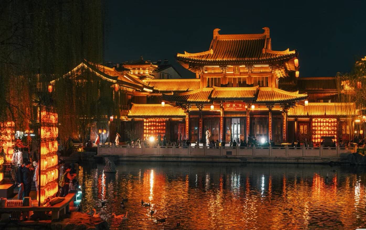 后游览开封人的待客厅【汴京小宋城】,回廊流水,亭台楼榭及戏台上传出的传统戏曲演唱声,仿佛瞬间把人带回了质朴又轻缓的北宋时代。加上周围小吃摊贩身上的古装,汇聚了流传千年的开封传统小吃上百种,有鹿家包子、曹婆婆家肉饼、齐氏大刀面、邢家锅贴、罗记炒凉粉、无腮黄焖鱼、王记鸡血汤、开封烩馍、罗家杏仁茶、炒红薯泥、冰糖红梨、江米甜酒等,使人仿佛步入历史画卷,一日梦回千年。
