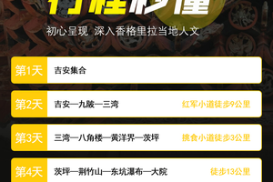 自行前往吉安集合(我们也可一起出发),古称“庐陵”“吉州”,素有“江南望郡”“金庐陵”“文章节义之邦”之称,不但文化古迹众多,革命旧居聚集风水好,而且自然风光和人文景观融为一体,是一个文化的家园,一个红色的摇篮,一个绿色的宝库。抵达早的伙伴,可以自行前往白鹿书院、庐陵纪念馆等。